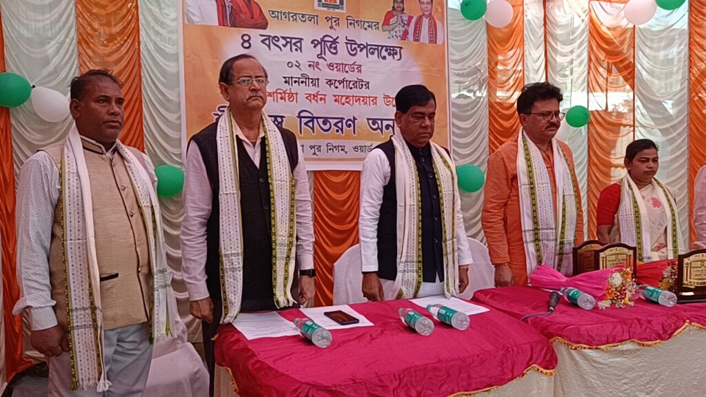 বছর পূর্তিতে ২ নং ওয়ার্ডের কর্পোরেটর শর্মিষ্ঠা বর্ধনের সংবর্ধনা, শীতবস্ত্র পেলেন ১০০ জনআগরতলা পুর নিগমের ২ নং ওয়ার্ডের কর্পোরেটর শ্রীমতি শর্মিষ্ঠা বর্ধনের দায়িত্বভার গ্রহণের ৪ বছর পূর্তি উপলক্ষে এক অনুষ্ঠানের আয়োজন করা হয়। অনুষ্ঠানে এলাকার নাগরিকদের উপস্থিতিতে এক আন্তরিক পরিবেশের সৃষ্টি হয়।অনুষ্ঠানে প্রধান অতিথি হিসেবে উপস্থিত ছিলেন আগরতলা পুর নিগমের মেয়র দীপক মজুমদার ও ৭ রামনগর বিধানসভার বিধায়ক দীপক মজুমদার। এছাড়াও উপস্থিত ছিলেন আগরতলা পুর নিগমের নর্থ জোনের চেয়ারম্যান প্রদীপ চন্দ্র, অ্যাসিস্ট্যান্ট মিউনিসিপ্যাল কমিশনার মানিক চাকমা, বড়জলা প্রাক্তন বিধায়ক ডা. দিলীপ কুমার দাস, বড়জলা ইনচার্জ মণ্ডল সভাপতি প্রবাল ভৌমিক সহ অন্যান্য বিশিষ্ট ব্যক্তিবর্গ।